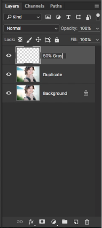 3. Change the Blending Mode of the 50% Gray layer to Overlay or Soft Light