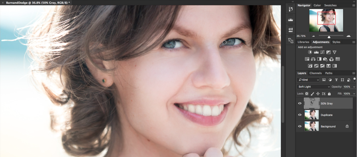 You can also use the actual Burn and Dodge Photoshop tools on the 50% gray layer. Not my favorite way, but if you do so; I’d recommending setting the Exposure of both tools to 25% before using them.