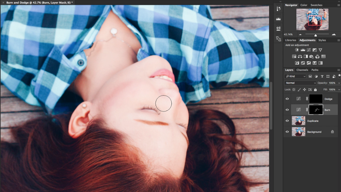 7. With the Brush Tool, paint White to reveal the darker areas on the Burn layer and paint white to reveal the lighter areas of the Dodge Layer